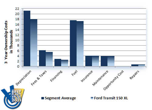 The Ford Transit 150 XL Low Roof Slide 130 WB won the 2021 Vincentric Best Fleet Value in Canada™ award in the Full-Size 1/2-Ton Passenger Van segment, making this the seventh consecutive time that it has been in the winner's circle.