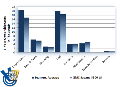 The GMC Savana 3500 LS 6.6L V8 155 WB was honoured with the 2021 Vincentric Best Fleet Value in Canada™ award in the Full-Size 1-Ton Passenger Van segment. The Savana 3500 rose to the top by having the best fuel economy in its class, which helped it outperform 5 competitor trims.