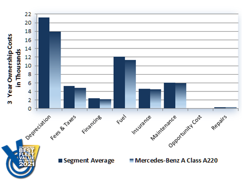 The Mercedes-Benz A Class A220 4MATIC won the Luxury Compact segment of the 2021 Vincentric Best Fleet Value in Canada™ awards. Having the lowest depreciation cost in its class was a key factor in taking home the victory.