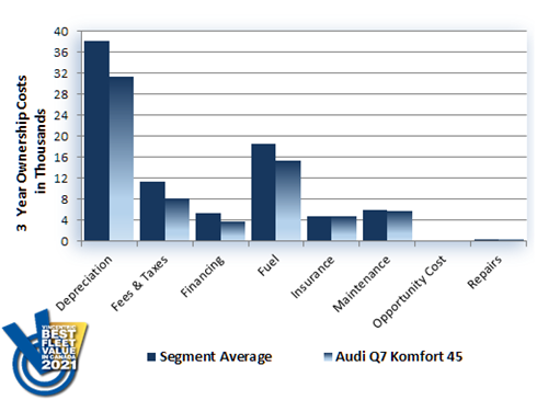 The Audi Q7 Komfort 45 won the Luxury Large SUV/Crossover segment of the 2021 Vincentric Best Fleet Value in Canada™ awards, aided by having the lowest operating costs in its class.