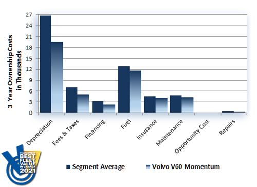 Returning to the winner's circle for the Luxury Wagon segment of the Vincentric Best Fleet Value in Canada™ awards was the Volvo V60 Momentum FWD T5, which triumphed for the third consecutive year. In an impressive performance, this V60 had the lowest depreciation, fuel, insurance, operating, and repair costs in its class for 2021.