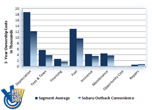 Returning to the winner's circle for the Mid-Size SUV/Crossover segment of the Vincentric Best Fleet Value in Canada™ awards was the Subaru Outback Convenience. This 2021 victory was aided by having the lowest insurance and operating costs in its class and marks the fifth consecutive win in this segment for the Outback.