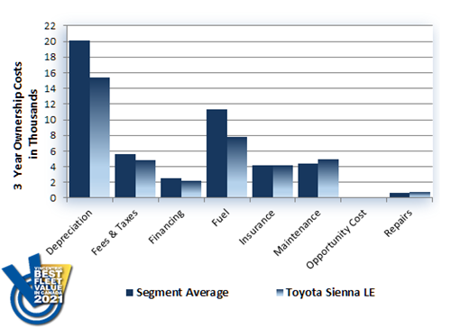 The Toyota Sienna LE FWD claimed the 2021 Vincentric Best Fleet Value in Canada™ award in the Minivan segment. Having the lowest operating costs in its class helped the Sienna LE FWD achieve this second-time win.