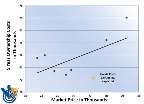 The Honda Civic took home the 2021 Vincentric Best Value in Canada™ award in the Compact segment. The Civic outperformed its competitors and won this segment for the second time by having both the lowest operating costs and lowest total cost of ownership in its class.