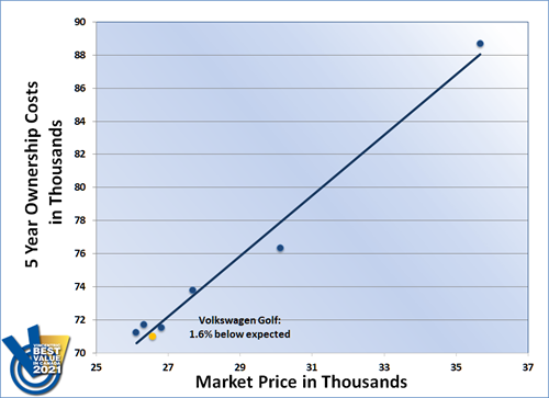 Triumphing in the Compact Hatchback segment of the 2021 Vincentric Best Value in Canada™ awards was the Volkswagen Golf. Having the lowest operating and insurance costs in its class helped propel the Golf to victory. In addition, the Golf had the lowest total cost of ownership of any Compact Hatchback!