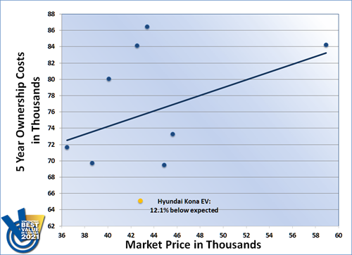 The Hyundai Kona EV won the 2021 Vincentric Best Value in Canada™ award in the Electric/Plug-In Hybrid SUV/Crossover segment. The Kona EV had the best fuel economy in its class along with the lowest total cost of ownership among its competitors, which helped lead it to this second-time victory.