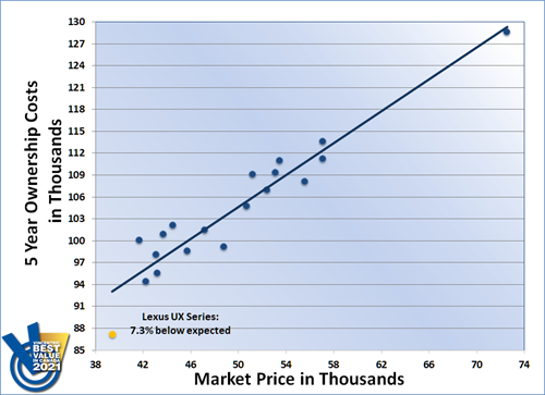 For the third consecutive year, the Lexus UX Series claimed the Vincentric Best Value in Canada™ award in the Luxury Compact SUV/Crossover segment. This repeat victory for 2021 was driven by having the lowest operating costs and the best fuel economy in its class, along with the lowest total cost of ownership of any Luxury Compact SUV/Crossover.