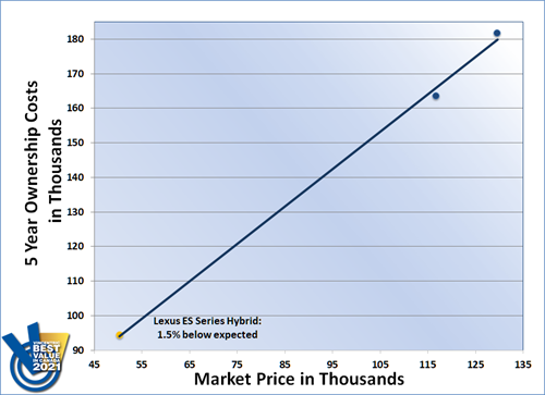 Returning to the winner's circle for an outstanding ninth time overall and sixth consecutive year, the Lexus ES Series Hybrid took home the 2021 Vincentric Best Value in Canada™ award in the Luxury Hybrid segment. The ES Series Hybrid had an impressive performance with the lowest insurance, maintenance, and repair costs in its class, as well as the best fuel economy. It also delivered the lowest total cost of ownership of any Luxury Hybrid!