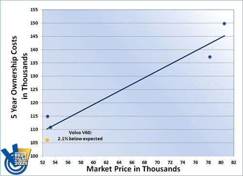 The Volvo V60 triumphed in the Luxury Wagon segment of the Vincentric Best Value in Canada™ awards for the second consecutive year. The V60 impressed for 2021 by having the lowest depreciation, insurance, maintenance, operating, and repair costs in its class. These strong results also helped the V60 deliver the lowest total cost of ownership of any Luxury Wagon.