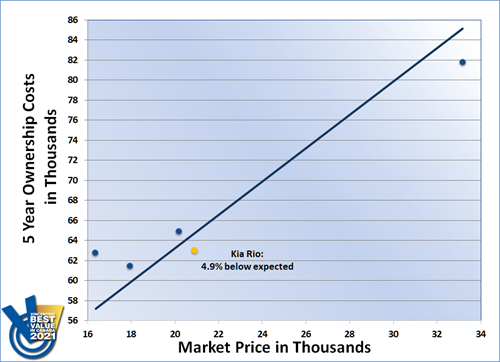 The Kia Rio won the 2021 Vincentric Best Value in Canada™ award in the Subcompact segment. Having the lowest repair cost in its class was a key factor in the Rio's victory.