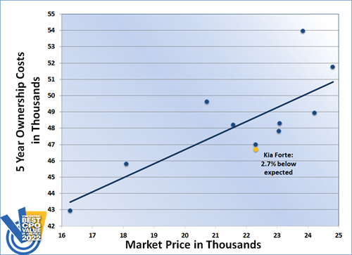 The Kia Forte was the winner in the Compact segment of the 2022 Vincentric Best CPO Value in America™ awards, aided by having the lowest operating costs and repair costs in its class.