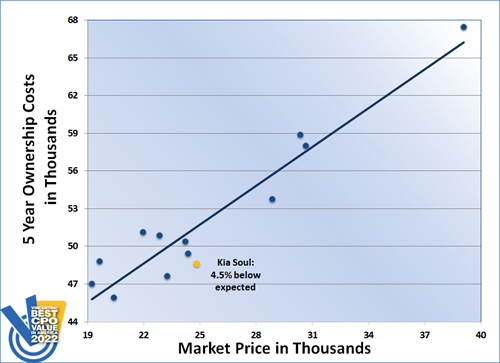 The Kia Soul earned the 2022 Vincentric Best CPO Value in America™ award in the Compact Hatchback segment. Having the lowest operating and repair costs in its class helped the Soul take top honors.