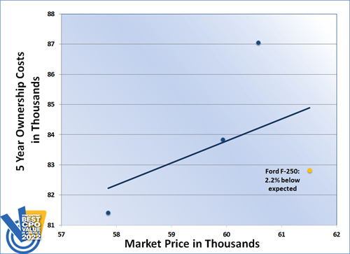 The Ford F-250 received the 2022 Vincentric Best CPO Value in America™ award in the Full-Size 3/4-Ton Pickup segment, due in no small part to the F-250 having the lowest operating costs and maintenance costs in its class.
