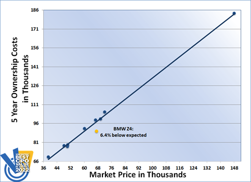 The Luxury Convertible segment of the 2022 Vincentric Best CPO Value in America™ awards was conquered by the BMW Z4. Key factors in the Z4's victory were its lowest operating and repair costs in its class.