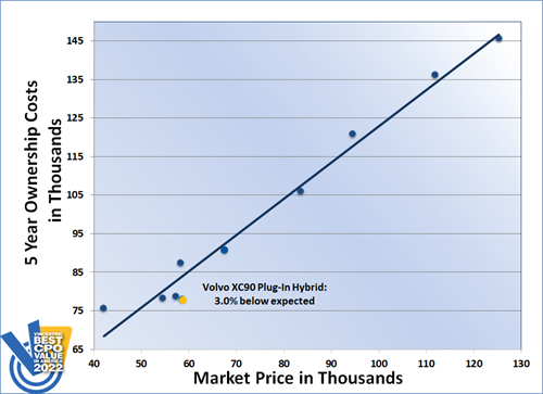 The 2022 Vincentric Best CPO Value in America Awards are based on the average of all trim levels for each model from the 2017-2021 model years. Costs are based on 5 years of ownership with annual mileage of 15,000. Graph shown is a visual representation of the actual results, but may not reflect the exact calculations. To learn more about this graph and how Vincentric measures value, click here.