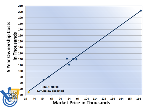 The 2022 Vincentric Best CPO Value in America Awards are based on the average of all trim levels for each model from the 2017-2021 model years. Costs are based on 5 years of ownership with annual mileage of 15,000. Graph shown is a visual representation of the actual results, but may not reflect the exact calculations. To learn more about this graph and how Vincentric measures value, click here.