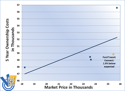 The Ford Transit Connect earned the Vincentric Best CPO Value in America™ award in the Small Commercial Cargo Van segment for the second year in a row. Having the lowest operating and maintenance costs in its class helped the Transit Connect remain the champion for 2022.