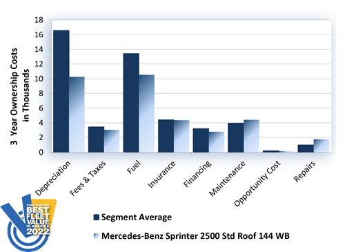 The Mercedes-Benz Sprinter 2500 Std Roof 144 WB earned the Vincentric Best Fleet Value in America™ award in the Full-Size 3/4-Ton Cargo Van segment. 2022 marks the sixth time the Sprinter 2500 has triumphed in this segment, with a key factor for this year being its lowest operating costs in its class.
