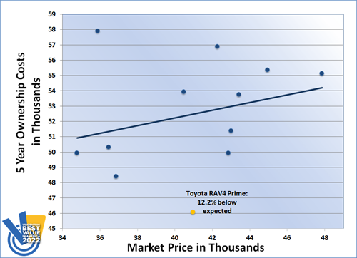 The Toyota RAV4 Prime received the 2022 Vincentric Best Value in America™ award in the EV/PHEV SUV segment. Having the lowest total cost of ownership in its class helped the RAV4 Prime earn its second consecutive victory.