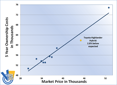 The Vincentric Best Value in America awards are based on the model level average of all trim levels within the model. Ownership costs for each trim level are measured at annual mileages of 10,000, 15,000, and 20,000. Graph shown is a visual representation of the actual results and may not reflect the exact calculations. To learn more about this graph and how Vincentric measures value, click here.
