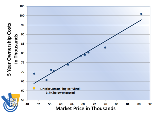 The Lincoln Corsair Plug-In Hybrid was honored with the 2022 Vincentric Best Value in America™ award in the Luxury EV/PHEV SUV segment. Key factors in the Corsair Plug-In Hybrid’s victory were its lowest insurance, repair, and total ownership costs in its class.