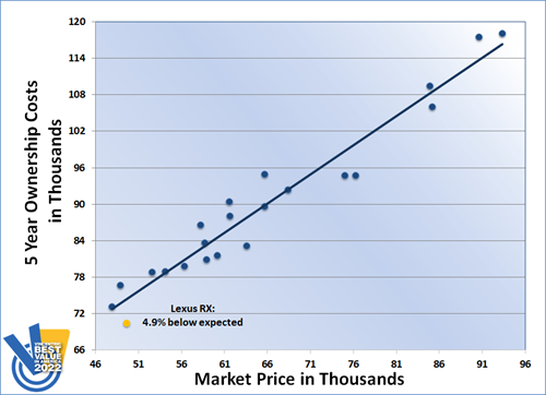 The Lexus RX triumphed in the Luxury Mid-Size SUV segment of the Vincentric Best Value in America™ awards, making this the second time it has claimed victory. The RX had the lowest total cost of ownership in its class for 2022 and outperformed 19 competitor models with ownership costs that were over 4% lower than expected.