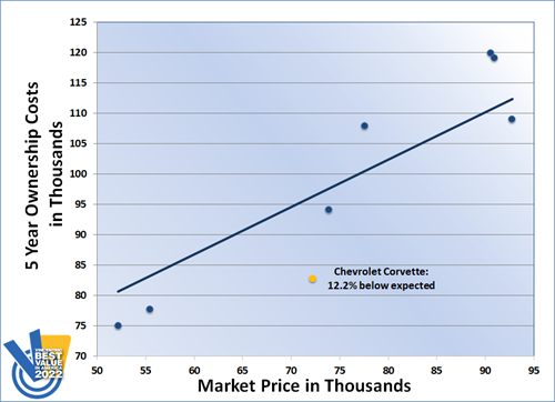 2022 marks the fourth time that the Chevrolet Corvette has won the Vincentric Best Value in America™ award in the Luxury Sports Car segment. The Corvette outperformed 7 competitor models to rise to the top of the podium, aided by having the lowest insurance cost in its class and ownership costs that were over 12% lower than expected.