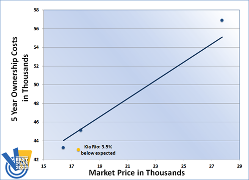 The Kia Rio earned the Vincentric Best Value in America™ award in the Subcompact Hatchback segment for the second year in a row. Having the lowest repair and total ownership costs in its class helped lead the Rio back into the winner’s circle for 2022.