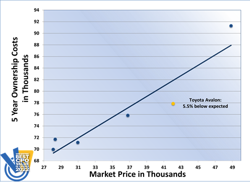 The Toyota Avalon received the 2022 Vincentric Best CPO Value in Canada™ award in the Large Sedan segment, aided by having the best fuel economy and the lowest operating costs in its class.