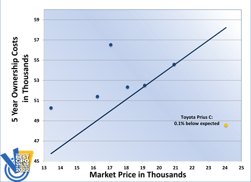 The Toyota Prius C won the 2022 Vincentric Best CPO Value in Canada™ award in the Subcompact segment. In an impressive performance, the Prius C had the lowest insurance, operating, maintenance, and total ownership costs in its class, as well as the best fuel economy.