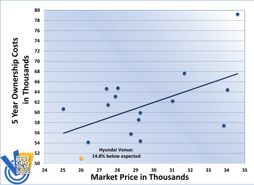 The Hyundai Venue won the 2022 Vincentric Best CPO Value in Canada™ award in the Subcompact SUV segment, aided by having the lowest maintenance cost and total ownership costs in its class.