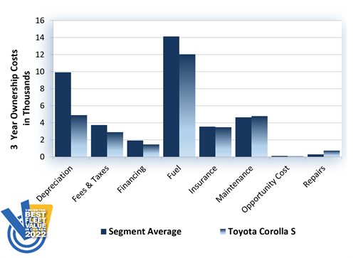 Returning for the fourth consecutive year, the Toyota Corolla S took home the Vincentric Best Fleet Value in Canada™ award in the Compact Hatchback segment. The Corolla S impressed for 2022 by having the best fuel economy and the lowest depreciation cost in its class.