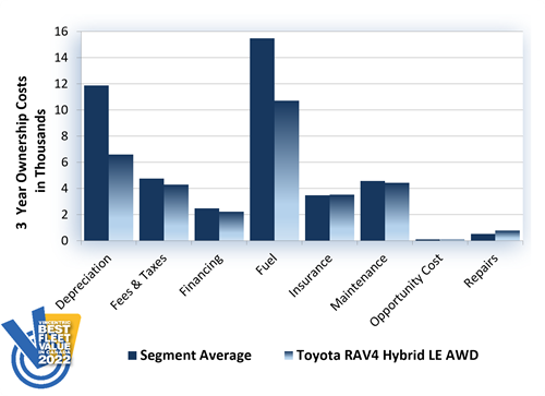 The Toyota RAV4 Hybrid LE AWD won the 2022 Vincentric Best Fleet Value in Canada™ award in the Compact SUV segment. The RAV4 Hybrid outperformed an outstanding 107 competitor trims to take home this fourth-time award for the model.