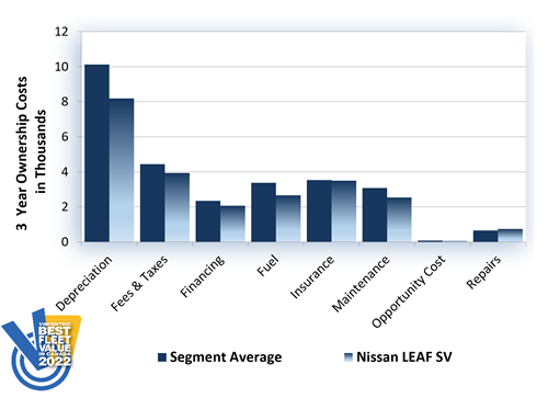 The Nissan LEAF SV earned the 2022 Vincentric Best Fleet Value in Canada™ award in the EV/PHEV segment. This is the third time overall that the LEAF has won this segment, with this year's victory helped by having the lowest depreciation and insurance costs in its class.