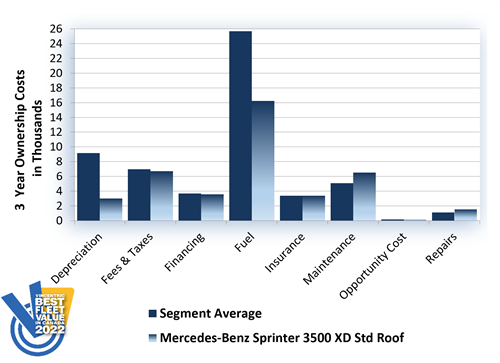 The Mercedes-Benz Sprinter 3500 XD Std Roof 144 WB 4 Cylinder Diesel won the 2022 Vincentric Best Fleet Value in Canada™ award in the Full-Size 1-Ton Cargo Van segment, making this year the sixth time overall that the Sprinter 3500 has been in the winner's circle. The Sprinter 3500 outperformed 44 competitor trims to achieve this repeat victory.
