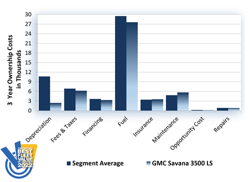The Full-Size 1-Ton Passenger Van segment of the 2022 Vincentric Best Fleet Value in Canada™ awards was conquered by the GMC Savana 3500 LS 6.6L V8 135 WB. Key factors in the Savana 3500 LS's victory were having the lowest fuel and operating costs in its class.