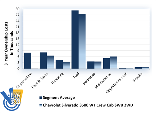 The Chevrolet Silverado 3500 WT Crew Cab SWB 2WD won the 2022 Vincentric Best Fleet Value in Canada™ award in the Full-Size 1-Ton Pickup segment, making this year the third time overall and second time in a row that the Silverado 3500 WT has claimed this segment. This repeat achievement was aided by having the lowest depreciation cost in its class that helped it outperform 128 competitor trims.