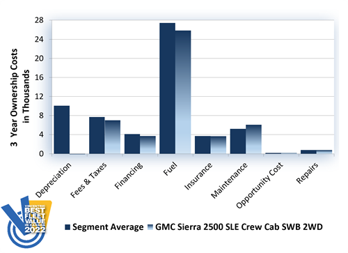 The GMC Sierra 2500 SLE Crew Cab SWB 2WD earned the 2022 Vincentric Best Fleet Value in Canada™ award in the Full-Size 3/4-Ton Pickup segment, aided by having the lowest depreciation cost in its class that helped it outperform 81 competitor trims.