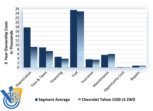 The Chevrolet Tahoe 1500 LS 2WD earned the top spot in the Large SUV segment of the 2022 Vincentric Best Fleet Value in Canada™ awards. A key factor in the Tahoe's victory was having the lowest insurance cost in its class.