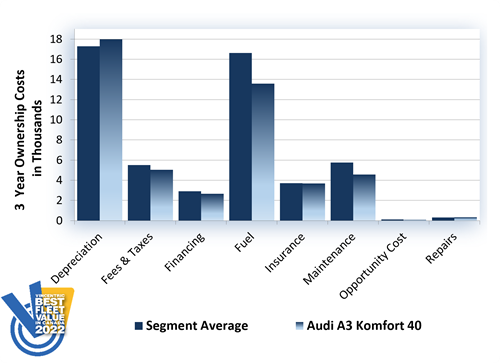 The Audi A3 Komfort 40 took home the win in the Luxury Compact segment of the 2022 Vincentric Best Fleet Value in Canada™ awards, aided by having the lowest fuel, maintenance, and operating costs in its class.