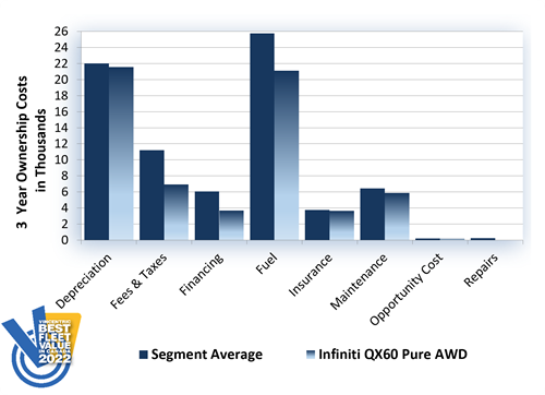 The Infiniti QX60 Pure AWD received the 2022 Vincentric Best Fleet Value in Canada™ award in the Luxury Large SUV segment, making this year the sixth time overall that the QX60 has triumphed. The QX60's rise to the top was helped by having the lowest repair and fuel costs in its class.