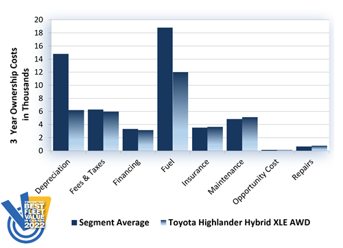 The Toyota Highlander Hybrid XLE AWD won the 2022 Vincentric Best Fleet Value in Canada™ award in the Mid-Size SUV segment. The Highlander Hybrid outperformed an impressive 95 competitor trims to earn a place in the winner's circle.