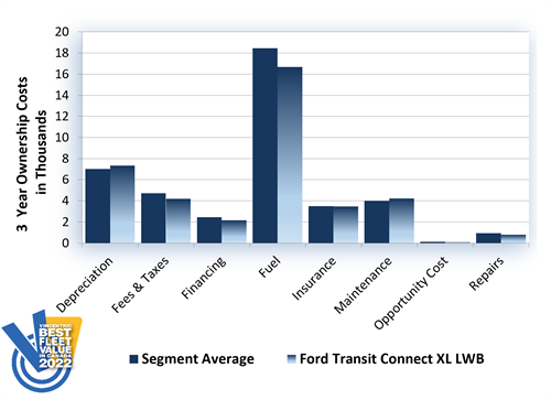 The Ford Transit Connect XL LWB earned the 2022 Vincentric Best Fleet Value in Canada™ award in the Small Commercial Cargo Van segment. The Transit Connect XL had the best fuel economy, lowest operating costs, and the lowest repair costs in its class, which helped lead it to this fourth-overall victory for the Transit Connect.