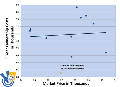 The Toyota Corolla Hybrid was honoured with the 2022 Vincentric Best Value in Canada™ award in the Compact segment, due in no small part to its lowest total cost of ownership in its class. The Corolla Hybrid outperformed nine competitor models to claim the top spot on the podium.