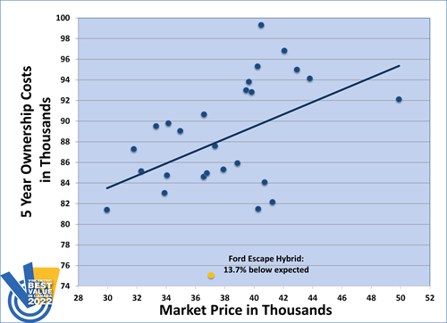 The Compact SUV segment of the 2022 Vincentric Best Value in Canada™ awards was conquered by the Ford Escape Hybrid. Key factors in the Escape Hybrid's best-in-class performance were its lowest operating and total ownership costs, and its best fuel economy in its class.