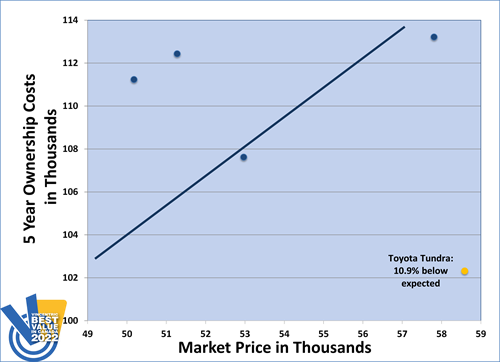 The Toyota Tundra received the 2022 Vincentric Best Value in Canada™ award in the Full-Size 1/2-Ton Pickup segment. Having the lowest depreciation, repair, and total ownership costs in its class helped the Tundra rise to the top of the podium.