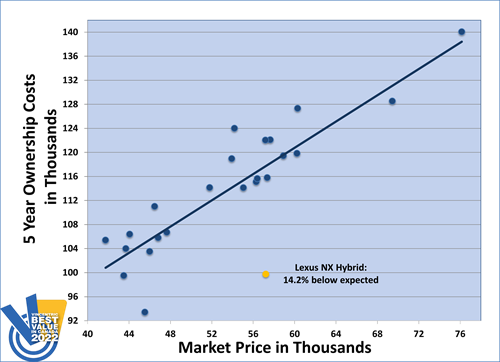 The Lexus NX Hybrid triumphed in the Luxury Compact SUV segment of the 2022 Vincentric Best Value in Canada™ awards. The NX Hybrid outperformed 21 competitor models, helped by having the lowest operating costs in its class.