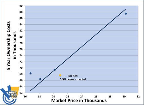 The Kia Rio won the 2022 Vincentric Best Value in Canada™ award in the Subcompact segment, making this the second victory in a row for the Rio. Having the lowest repair cost in its class helped the Rio return to the winner's circle.