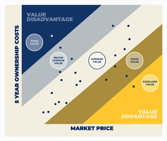 Next, vehicles are assigned to segments based on vehicle type, market position, and size. This allows Vincentric to determine a vehicle's "expected" cost of ownership based on a statistical model that correlates the price and cost of ownership of the vehicles within that specific segment. This correlation is represented graphically in the chart below by the line identified as "average value." Any vehicle that falls below the average value line is a better value than a vehicle that is above the average value line.