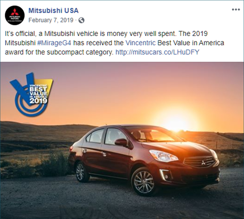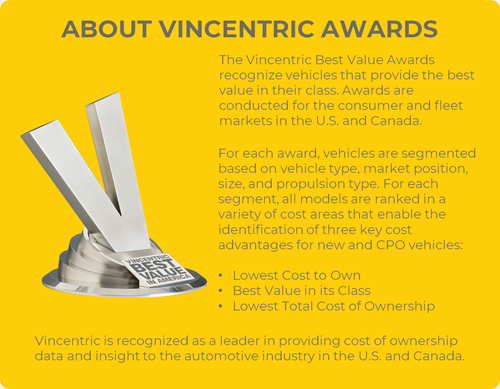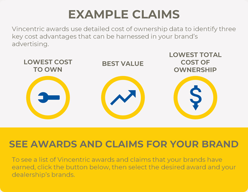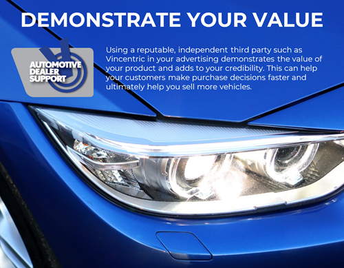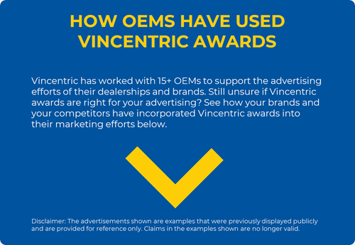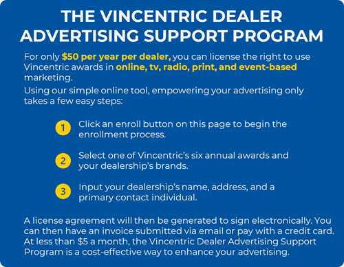 Vincentric awards and advertising claims can help you sell more vehicles! Simply enroll in our Dealer Advertising Support Program and automatically be licensed to use all available awards and claims for the vehicles you sell in your advertising. More information and OEM advertisement examples are below.